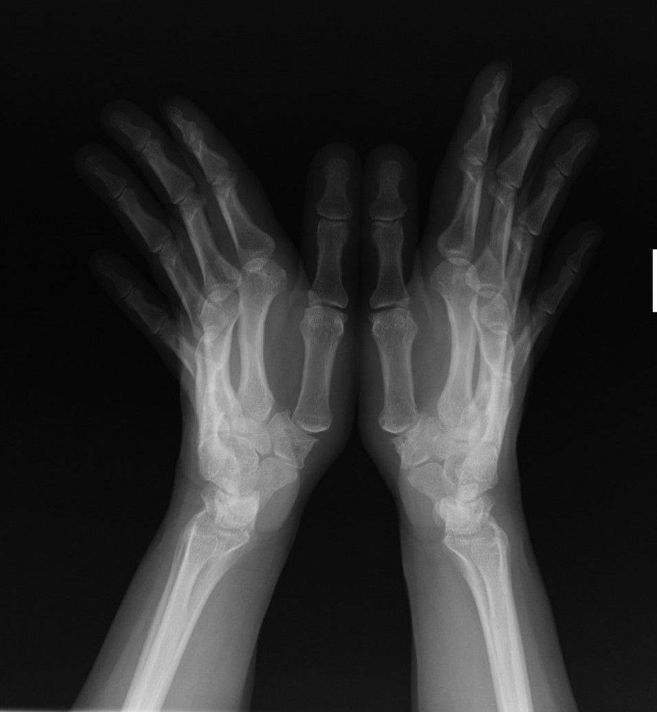 40 yr, female, right hand dominant Right wrist and 1st CMC joint pain for 1 year Mild pain relief after intraarticular corticosteroid injection for the 1st CMC joint No pain relief after NSAIDs, physical therapy EMG: Mild carpal tunnel syndrome